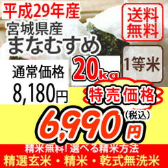 【お買い物マラソン開催!】【特売価格!】【玄米】【送料無料】平成29年産 宮城産 まなむすめ[1等米] 20kg 選べる精米方法