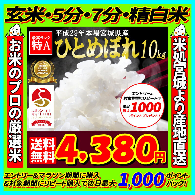 エントリー&対象期間リピートで最大1000ポイント!29年産 宮城県産 ひとめぼれ 10kg!玄米,5分,7分,精白米(精米時重量約1割減)【米】【0406】【dp】【ne】