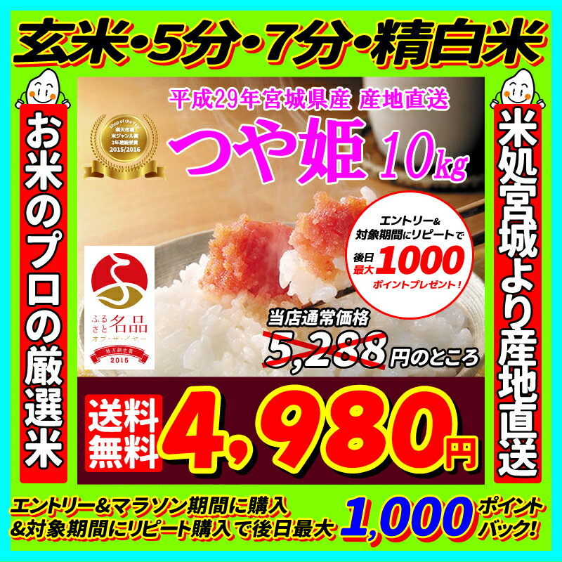 エントリー&対象期間リピートで最大1000ポイント!29年産 宮城県産 つや姫 10kg!玄米,5分,7分,精白米(精米時重量約1割減)【米】【0406】【dp】【ne】