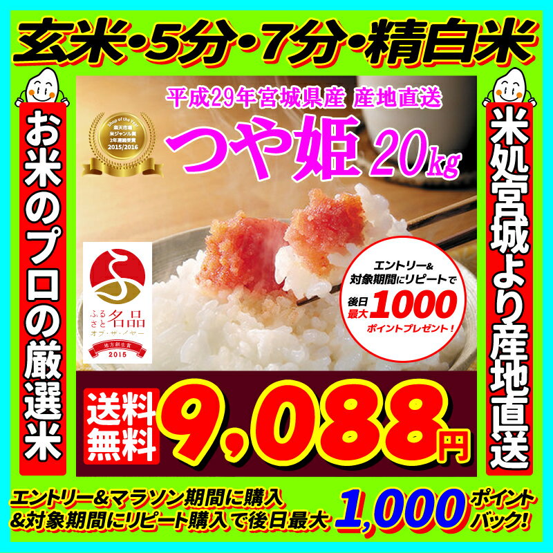 エントリー&対象期間リピートで最大1000ポイント!29年産 宮城県産 つや姫 20kg!玄米,5分,7分,精白米(精米時重量約1割減)【米】【dp】【ne】【0406】