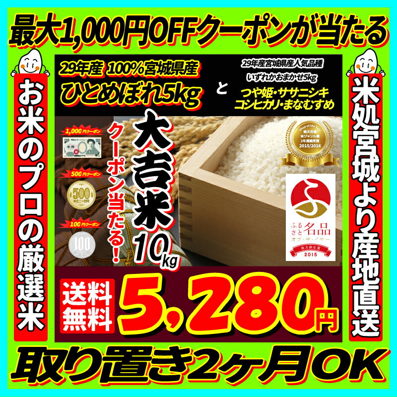 エントリー&対象期間リピートで最大1000ポイント!29年産 大吉米10kg 宮城県産ひとめぼれ5kgと29年お任せ品種5kg(コシヒカリ・つや姫・ササニシキ・まなむすめ)!さらに最大1,000円OFFクーポンが当たる!大吉米10kg【米】【dp】【ne】【SS03】